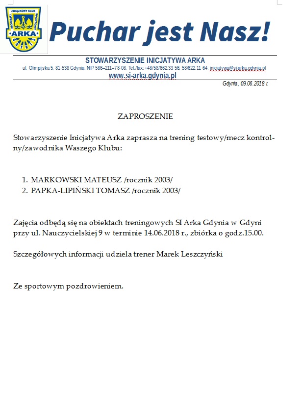 Natomiast Tomasz Lipiński to środkowy obrońca, w zespole Borowiaka gra od czterech lat. Również jak i Mateusz, przebywał na pięciodniowej obserwacji w zespole Błękitnych Wronki. Interesowały się nim między innymi Lechia Gdańsk i Chojniczanka Chojnice. Testy w zespole Arki Gdynia rozpoczną się czternastego maja i będą odbywały się na obiektach treningowych SI Arka Gdynia w Gdyni przy ulicy Nauczycielskiej 9. Naszym zawodnikom życzymy powodzenia!