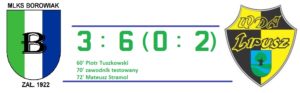 Wda Lipusz od pierwszego gwizdka prowadziła grę, a zawodnicy Borowiaka umiejętnie ustawiali się w obronie i skutecznie utrudniali rozgrywanie piłki przeciwnikom. Dopiero w 30 minucie spotkania, po błędzie formacji defensywnej, straciliśmy gola. Przy stanie 0:1 po jednej z kontr mieliśmy doskonałą sytuację do wyrównania. Zawodnik testowany minął dwóch obrońców i w sytuacji sam na sam z bramkarzem posłał futbolówkę w słupek. Tuż przed przerwą goście podwyższyli wynik meczu na 0:2. Bramkarz gospodarzy „wypluł” piłkę posłaną z rzutu rożnego i do pustej bramki dobił ją dobrze ustawiony Jakub Gronowski.