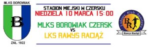 Piłkarze Borowiaka Czersk w niedzielę zagrają ostatni sparing w okresie przygotowawczym przed inauguracją rundy wiosennej 2018/2019. Przeciwnikiem będzie A- klasowy LKS Rawys Raciąż.