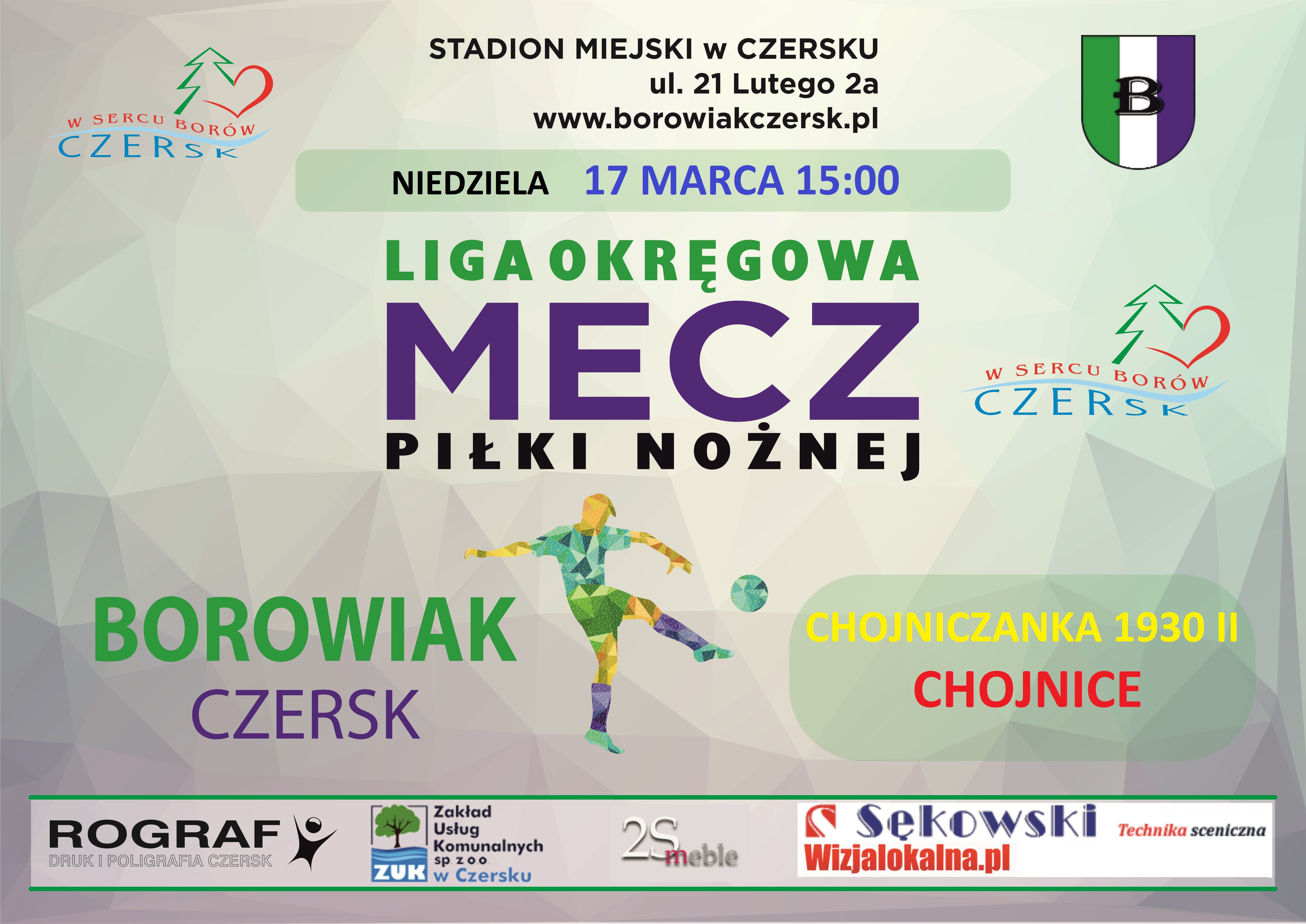 Pierwszy mecz o ligowe punkty Borowiak rozegra w niedzielę 17 marca. Na Stadionie Miejskim w Czersku zmierzy się z MKS Chojniczanka 1930 II Chojnice. W derbowym hicie kolejki zespół z Chojnic dostanie spore wsparcie pierwszoligowych zawodników. Na ten moment już wiemy, że do zespołu rezerw zostali przesunięci: Emil Drozdowicz, Tomasz Foszmańczyk, Deleu i Serhiy Pylypchuk. Zapewne nie będą to jedyne wzmocnienia, gdyż pierwszy zespół swój mecz gra dzień wcześniej z Chrobrym Głogów.