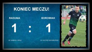 – Grać przez prawie 30 minut w dziesięciu przeciwko Raduni, na jej boisku w takich warunkach atmosferycznych i to wytrzymać?! Coś niesamowitego! Każdy wie, że nie jest łatwo się bronić w takiej sytuacji. Mój zespół pokazał dzisiaj charakter. Cieszymy się z remisu, który smakuje prawie jak zwycięstwo! – po meczu powiedział szkoleniowiec Borowiaka – Artur Papierowski.