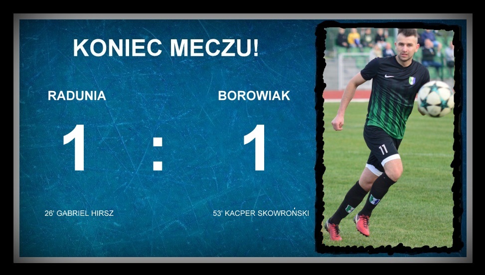 Goście dobrze zaczęli zawody z Radunią II Stężyca, ale ostatecznie po pierwszej połowie więcej powodów do zadowolenia mieli gospodarze, którzy po nerwowych pierwszych fragmentach rywalizacji w 26. minucie objęli prowadzenie po składnej akcji całej formacji ofensywnej. Przybyli kibice oglądali próby konstruowania ataku pozycyjnego, a także uważną grę w defensywie. Borowiak wyglądał solidnie w obronie, a wraz z upływem kolejnych minut coraz śmielej poczynał sobie w ataku i wypracował kilka dogodnych sytuacji (rzut wolny z 17 metra, celne uderzenia Karola Kortasa czy strzał Patryka Dudy prosto w bramkarza).