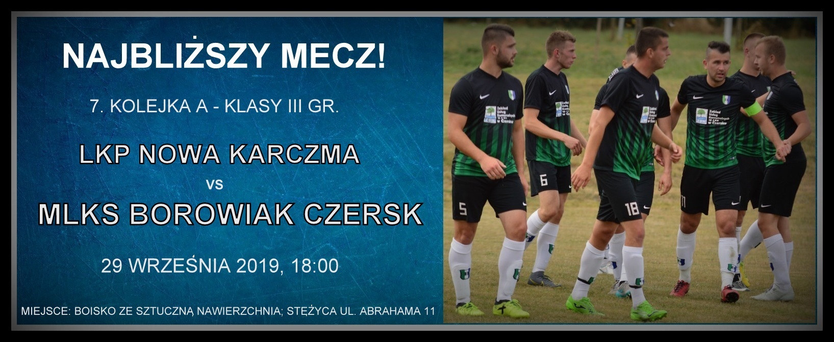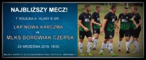 Ostatnia w tabeli LKP Nowa Karczma podejmie prowadzący w lidze MLKS Borowiak Czersk w niedzielnym meczu 7. kolejki A – klasy III grupy.