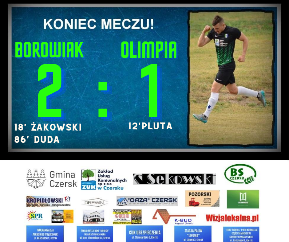 W 2. kolejce Ligi Okręgowej piłkarze z Czerska wygrali 2:1 z Olimpią. Po raz kolejny zawodnicy trenera Artura Papierowskiego odwrócili losy meczu. Musieli „gonić” wynik, gdyż od 12 minuty przegrywali 0:1 po bramce z rzutu karnego. Wszystko siedzi przede wszystkim w głowach. Piłkarze gospodarzy nie załamali się i już sześć minut później, kapitalną asystą zrzutu wolnego popisał się Kevin Wojciechowski, a do wyrównania z „głowy” doprowadził Mateusz Żakowski. Jednak w tym spotkaniu piłkarze z Czerska nie prezentowali się najlepiej. Gospodarze przez długi czas nie potrafili stworzyć sobie klarownych sytuacji bramkowych. Dopiero w drugiej połowie zobaczyliśmy zupełnie inne oblicze walczącego o trzy punkty Borowiaka. Kiedy wydawało się już, że mecz zakończy się remisem 1:1, szalę zwycięstwa na swoją stronę przechylili gospodarze. W 87. minucie zwycięstwo Borowiakowi zapewnił duet Marek Kaszubowski – Patryk Duda. Ten pierwszy popisał się asystą, a strzał na wagę trzech oczek oddał Patryk Duda. Z dziennikarskiego obowiązku musimy dodać, że w 71 minucie spotkania przy wyniku 1:1 nie strzelamy rzutu karnego. Na wyróżnienie zasługuje debiut bramkarza Mateusza Polakowskiego, który swoją postawą dodał trochę pewności w poczynania gospodarzy.