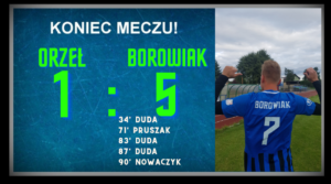 W drugiej części spotkania obraz gry zmienił się na korzyść gospodarzy. Jednak bardzo długo, bo aż do 71 minuty, nie potrafili przechylić szali zwycięstwa na swoją korzyść i zagrozić bramce Mateusza Polakowskiego. W 71 minucie po składnej akcji piłka trafiła do Patryka Dudy, który wbiegł na pełnej prędkości w pole karne i w okolicy linii końcowej podał do nabiegającego z drugiej strony bramki Roberta Pruszaka, a ten celnym uderzeniem wyprowadził Borowiaka na prowadzenie. W końcówce spotkania jeden z zawodników gospodarzy otrzymał czerwoną kartkę za niesportowe zachowanie. Orzeł chcąc doprowadzić do wyrównania musiał mocniej zaatakować, co spowodowało stratę kolejnych trzech bramek. Z dziennikarskiego obowiązku musimy dodać, że dwóch z trzech wprowadzonych zawodników przez trenera Artura Papierowskiego zaliczyło asysty. Przy bramkach Patryka Dudy na 1:3 asystował Karol Kortas, a przy bramce na 1:4 Bartłomiej Węckowski. W 90 minucie gola zdobył Dariusz Nowaczyk, który uderzeniem z półobrotu ustalił wynik spotkania na 1:5.