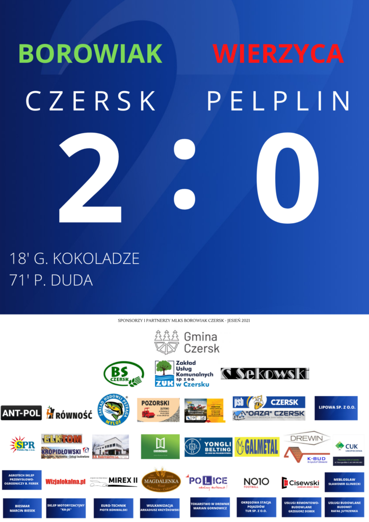Borowiak wreszcie na zero z tyłu Czerszczanie po dobrym spotkaniu pokonują na własnym stadionie Wierzycę Pelplin 2:0. Bramki dla gospodarzy zdobył Guladi Kokoladze oraz Patryk Duda. Jednak najbardziej cieszy dobra organizacja gry w obronie!