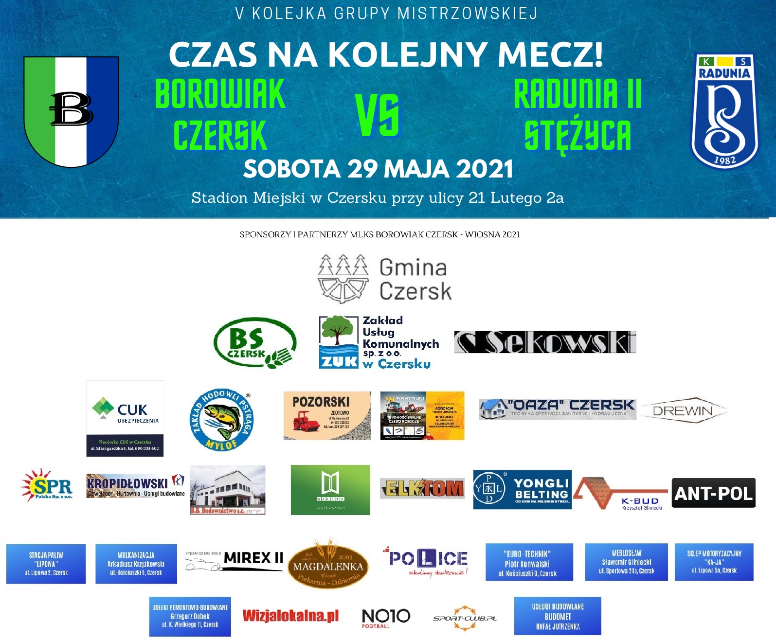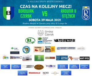Spotkanie z Radunią II Stężyca odbędzie się w sobotę – 29.05.2021 r. o godzinie 18.00 na Stadionie Miejskim w Czersku przy ulicy 21 Lutego 2a. Serdecznie zapraszamy wszystkich sympatyków Borowiaka na mecz z Radunią II Stężyca.