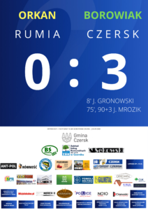 Borowiak Czersk pokonał Orkan Rumia 3:0 (1:0) w 13. kolejce RWS Investment Group. Czerszczanie w dobrym stylu odpowiedzieli na ostatnią porażkę z Pogonią Lębork. Była to pierwsza wygrana podopiecznych trenera Artura Papierowskiego w meczach wyjazdowych. Bramki w Rumi strzelili Jakub Gronowski oraz dwukrotnie z rzutów karnych Jakub Mrozik.