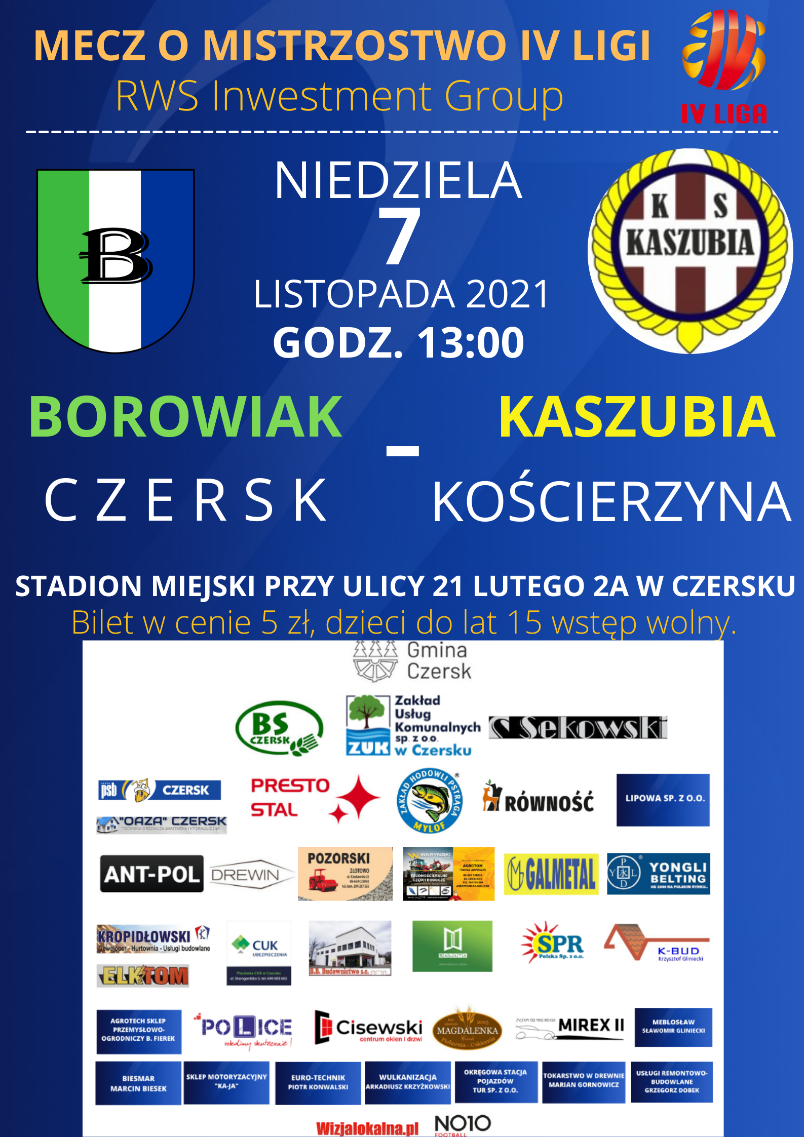 Drużyna z Kaszub gra bezkompromisowo, do przodu, otwarcie, strzela dużo goli. Piłkarze Borowiaka muszą uważać na przody, bo są tam zawodnicy, którzy potrafią obsłużyć kolegów dobrym prostopadłym podaniem. Najbliższy rywal czerszczan jest mocny, gra z pomysłem i czeka nas ciekawy pojedynek. Liczymy, że czerszczanie wzniosą się na wyżyny, by wygrać. Początek meczu Borowiak Czersk – Kaszubia Kościerzyna w niedzielę o 13.00 na Stadionie Miejskim w Czersku przy ulicy 21 Lutego 2 A. Liczymy, że licznie przybyli tego dnia kibice wspomogą nasz zespół w odniesieniu zwycięstwa.