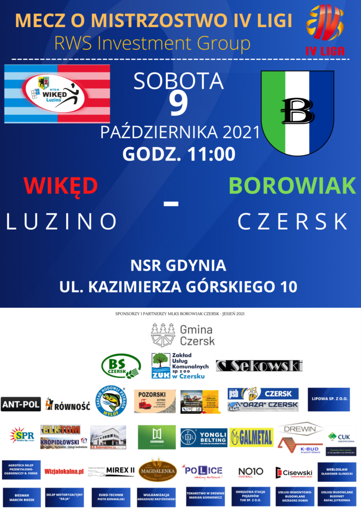 Czerski Borowiak w X kolejce RWS Investment Group IV ligi zmierzy się na wyjeździe z Wikęd Luzino. Już tylko pięć kolejek pozostało piłkarzom z Czerska do zakończenia jesiennych zmagań w tym sezonie. Za tydzień Borowiak będzie miał pauzę, a kolejki XVII – XXI zostały zaplanowane na wiosnę.
