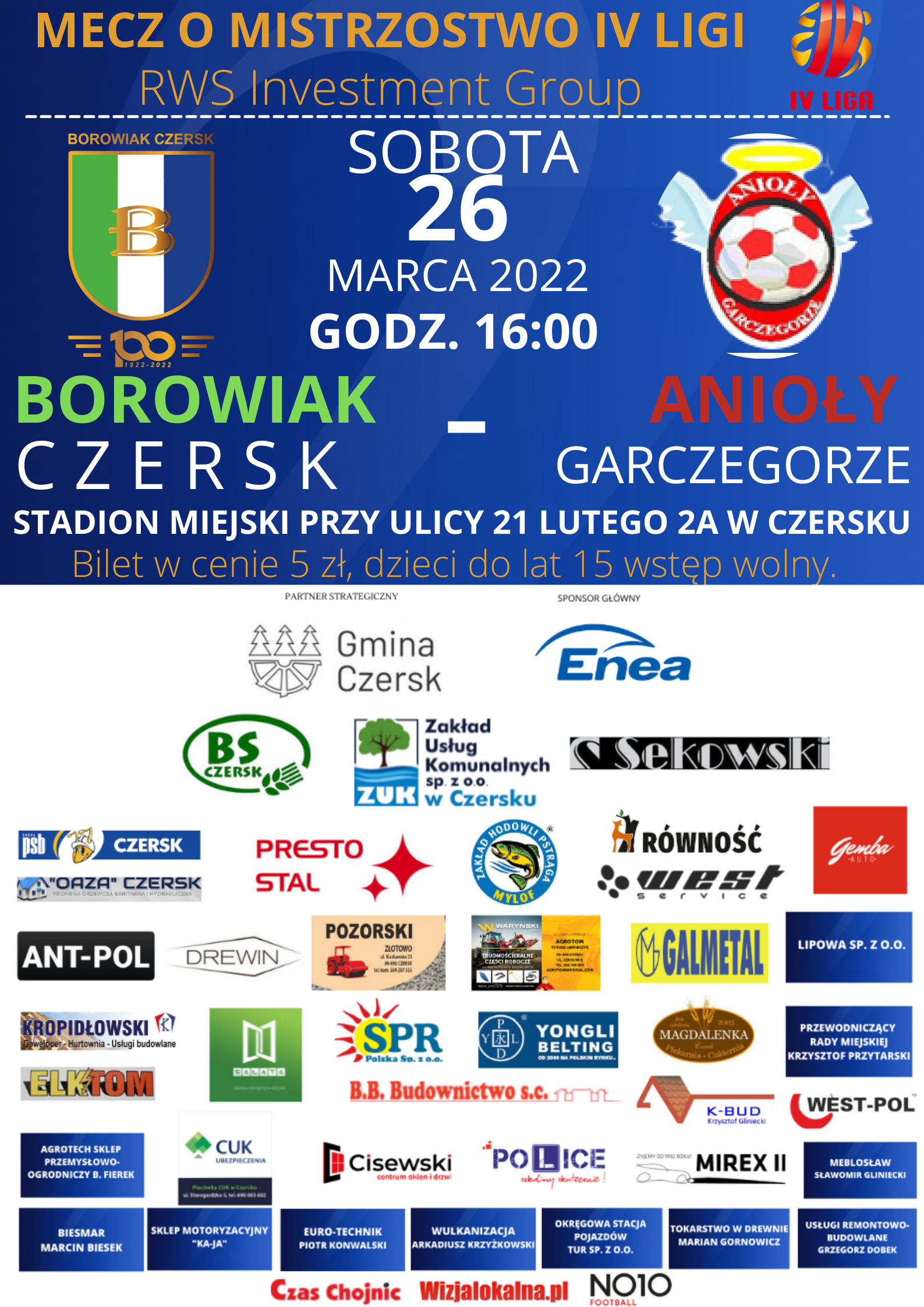 Początek meczu Borowiak Czersk – Anioły Garczegorze w sobotę o 16.00 na Stadionie Miejskim w Czersku przy ulicy 21 Lutego 2a. Wspomóż swoim dopingiem drużynę Borowiaka, aby po raz kolejny wygrała i zbliżyła się do upragnionego utrzymania w IV lidze!