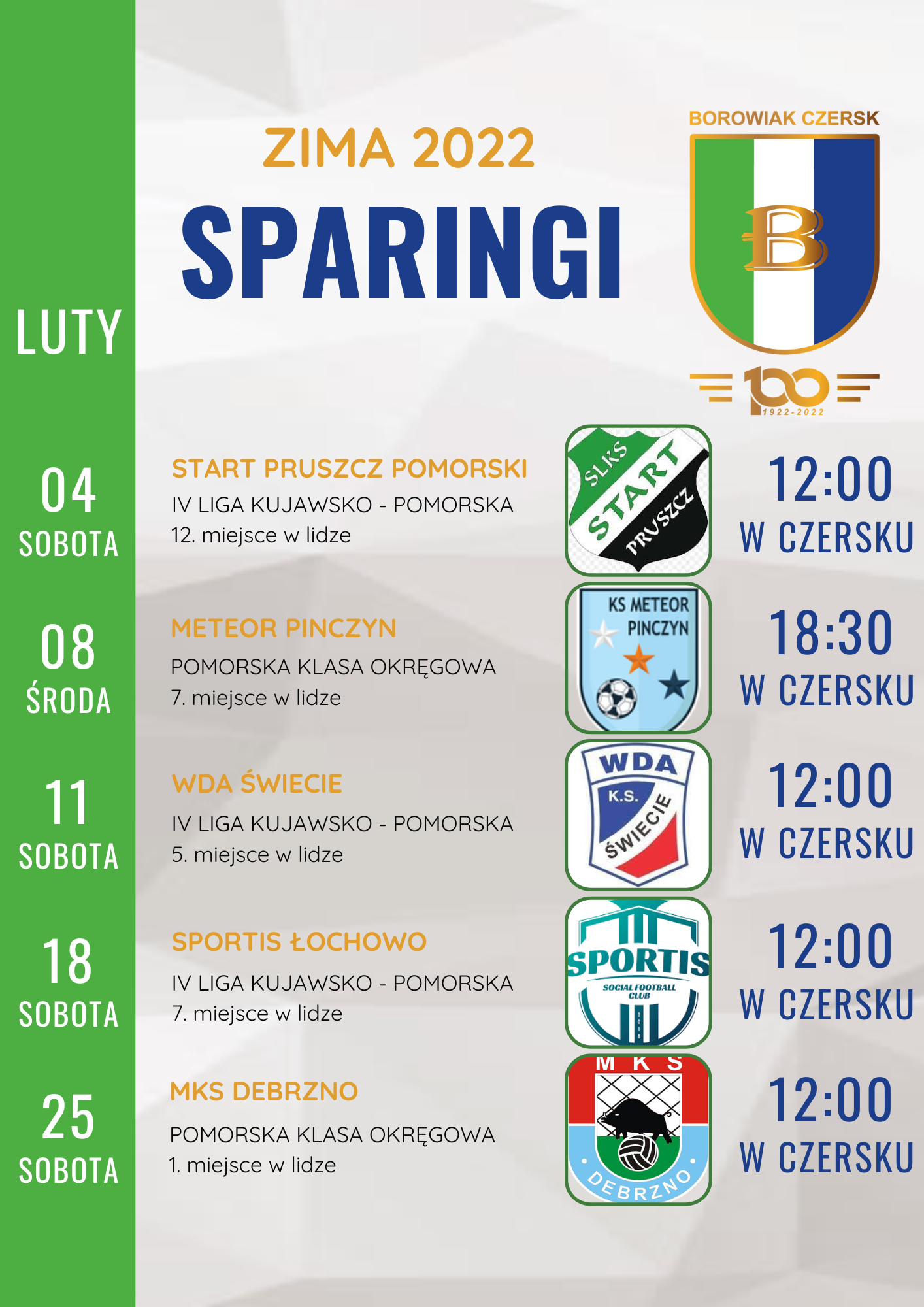 Znamy terminarz meczów sparingowych Borowiaka Czersk i przedstawiamy go na załączonej grafice. Nasz zespół dzięki wybudowaniu przez gminę Czersk pełnowymiarowego boiska ze sztuczną nawierzchnią, wszystkie spotkania po raz pierwszy rozegra na swoim nowym obiekcie.